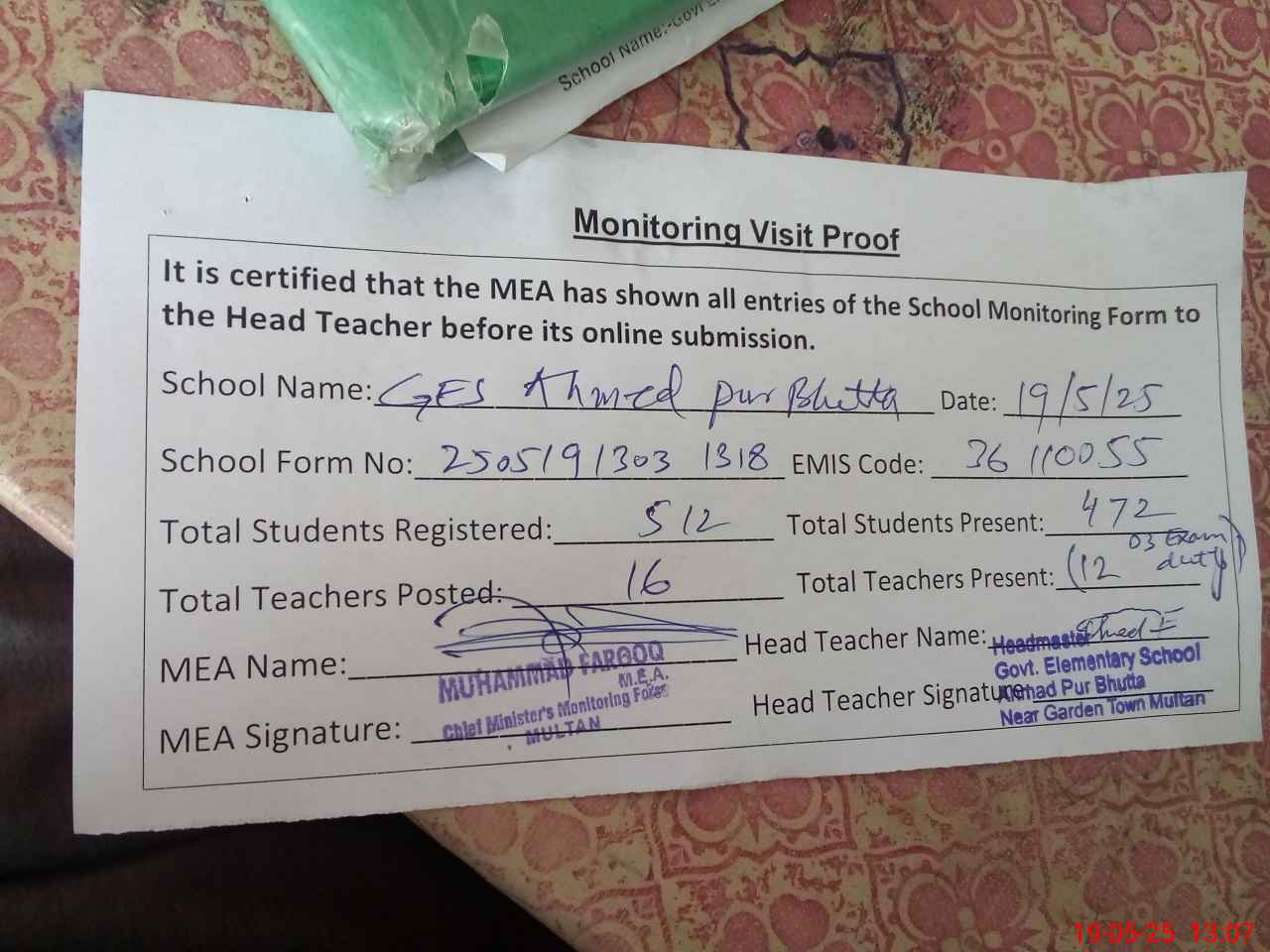 | Attendance Register | Head Teacher | MEA with School | Visit Proof |