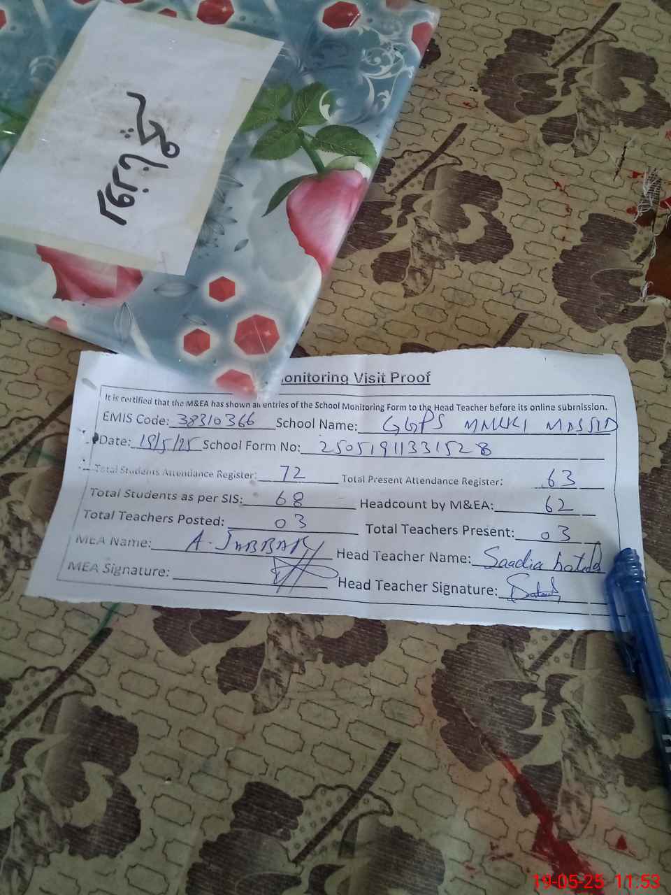 | Attendance Register | Head Teacher | MEA with School | Visit Proof |