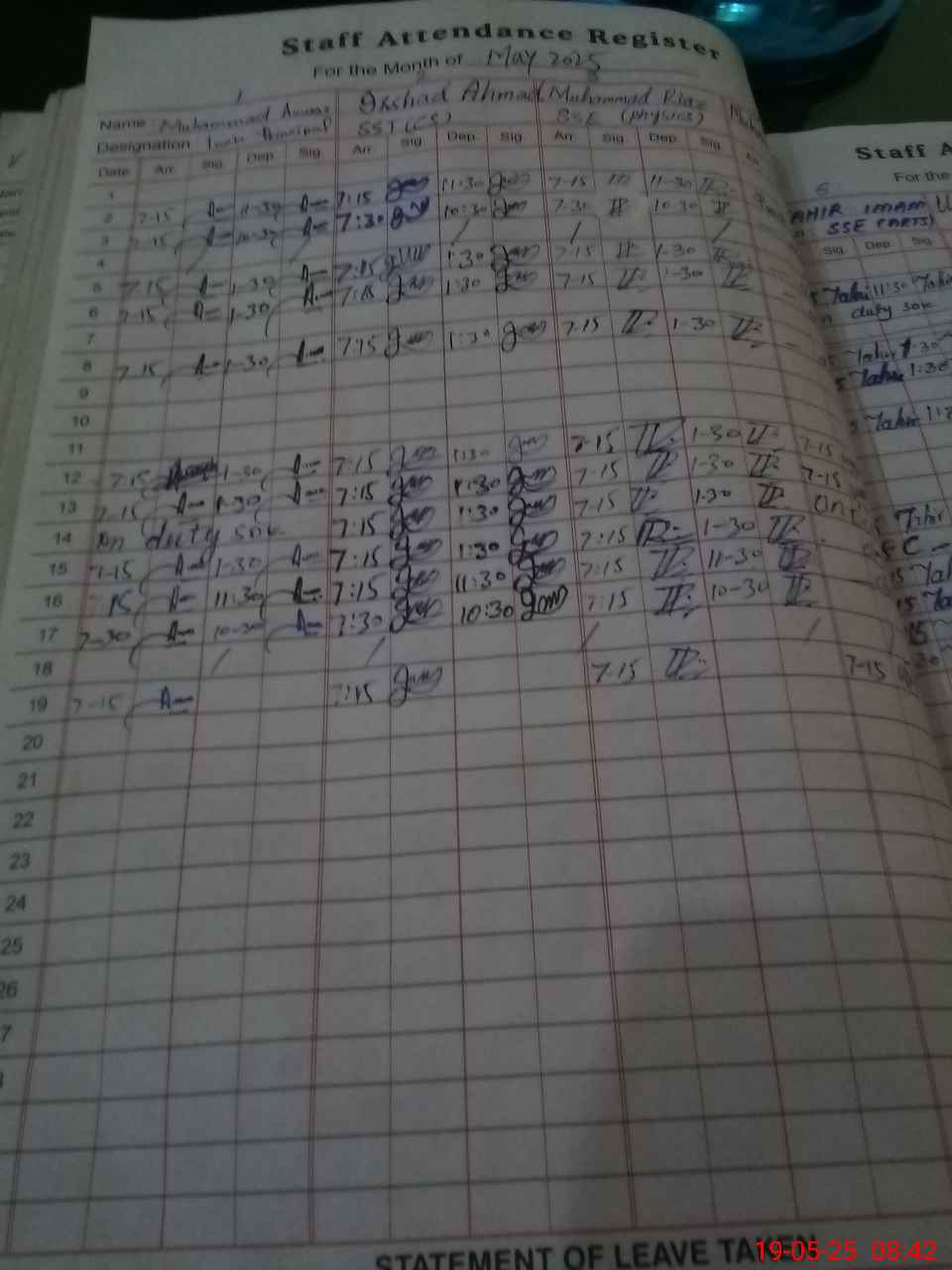 | CNIC | Full Name | Designation | R/C | Absence during last cal. month |