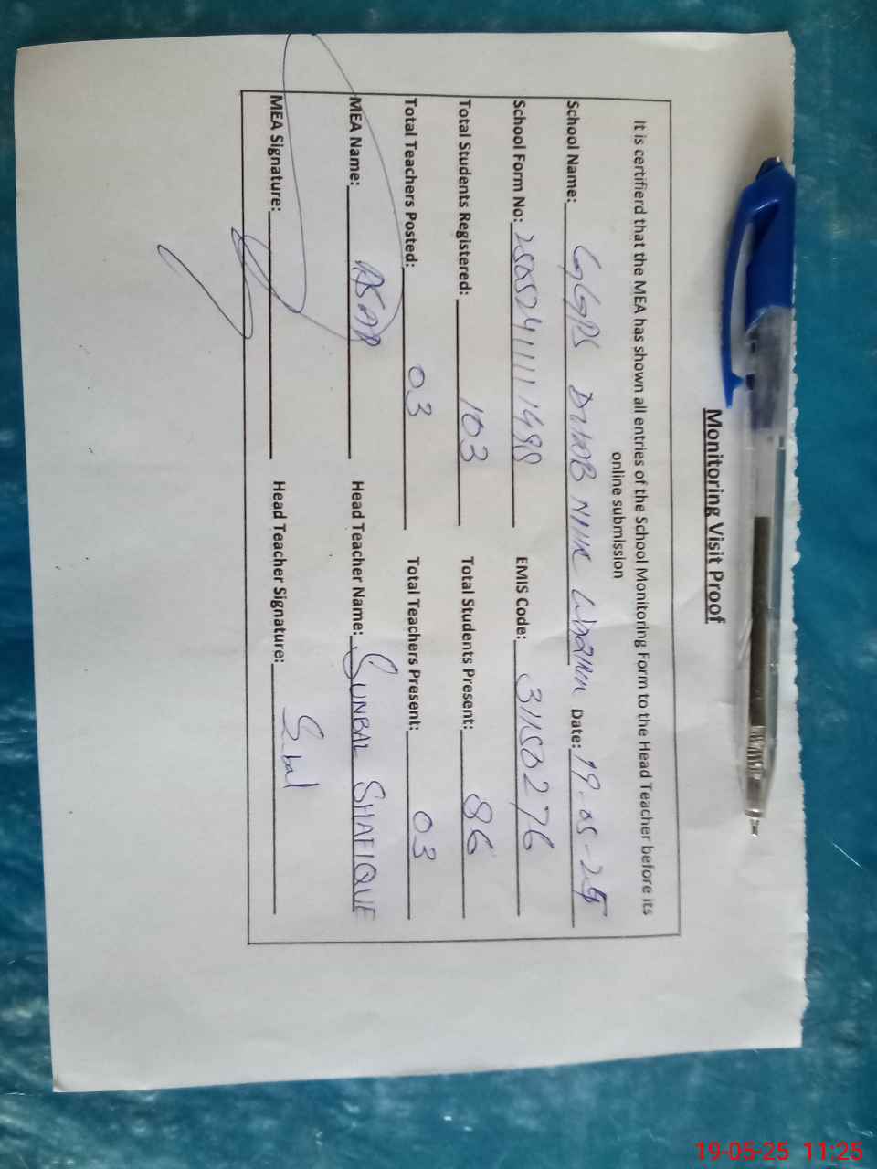 | Attendance Register | Head Teacher | MEA with School | Visit Proof |