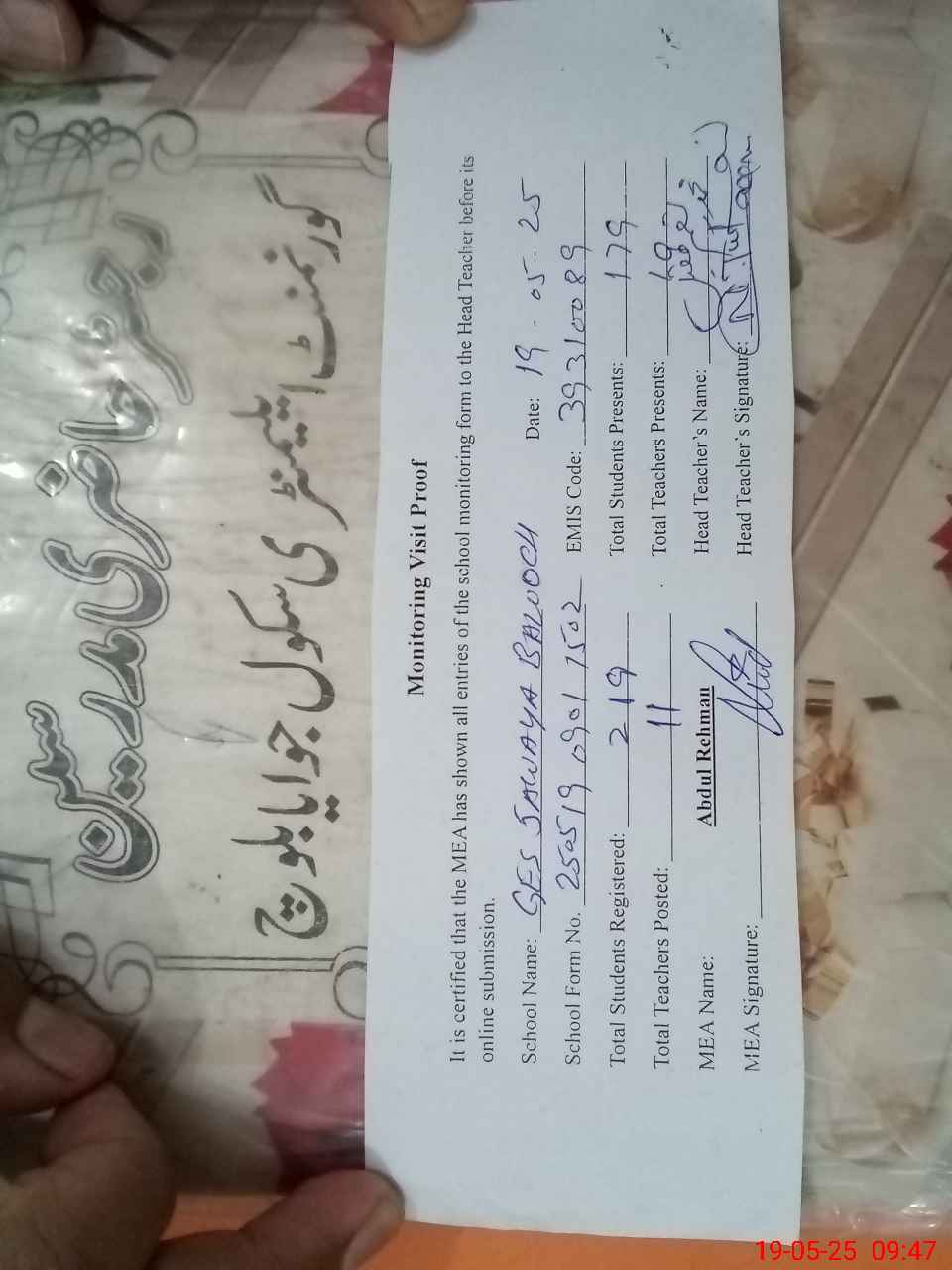 | Attendance Register | Head Teacher | MEA with School | Visit Proof |