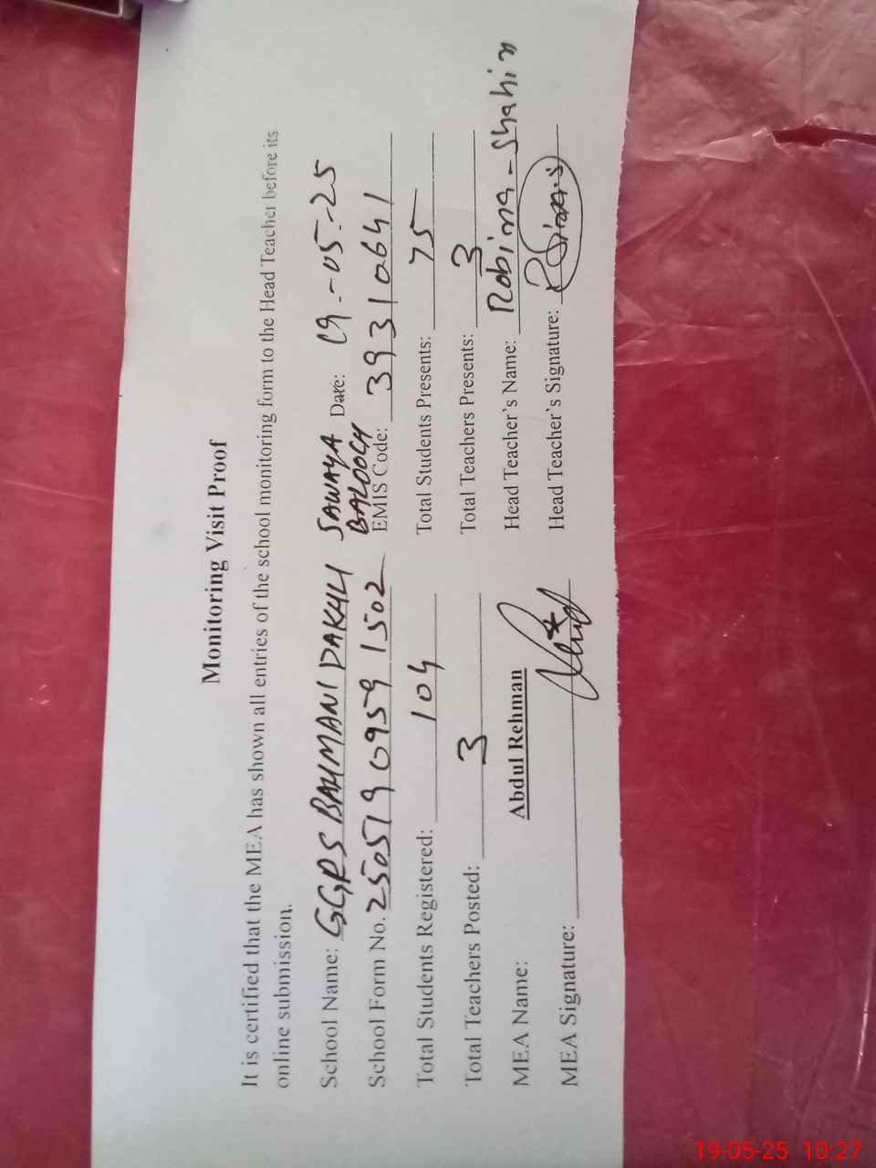 | Attendance Register | Head Teacher | MEA with School | Visit Proof |