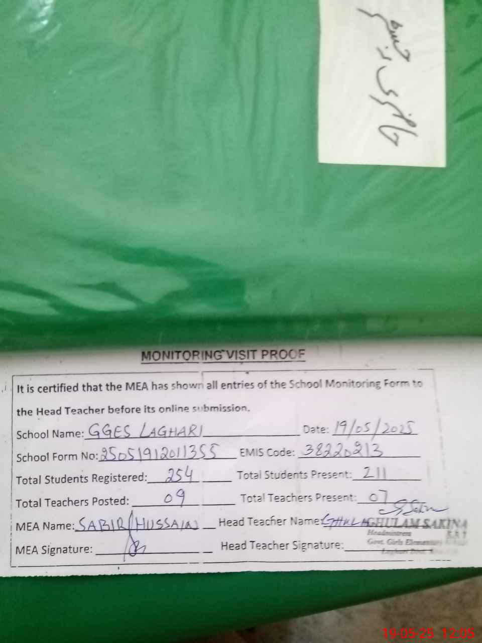 | Attendance Register | Head Teacher | MEA with School | Visit Proof |