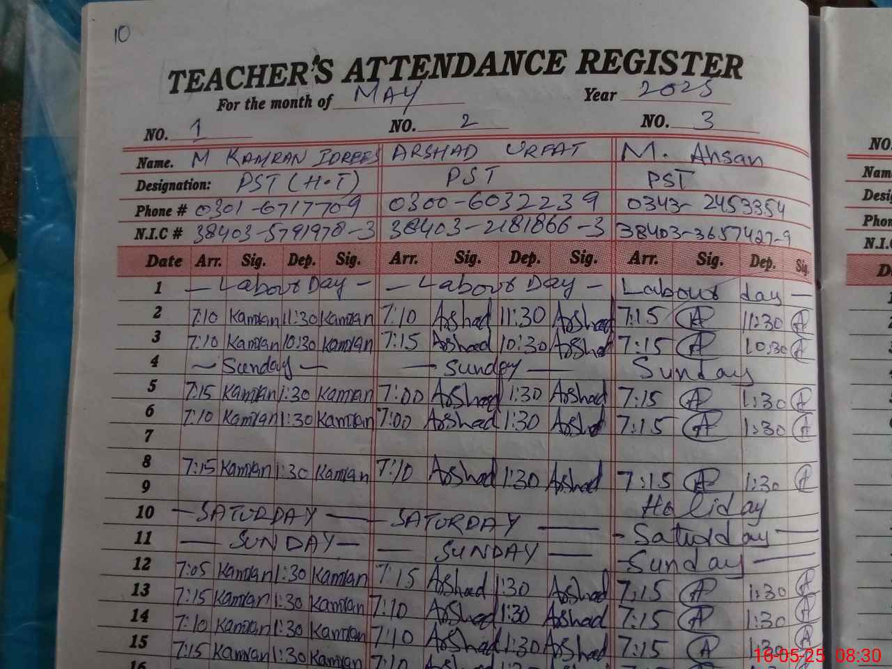 | CNIC | Full Name | Designation | R/C | Absence during last cal. month |