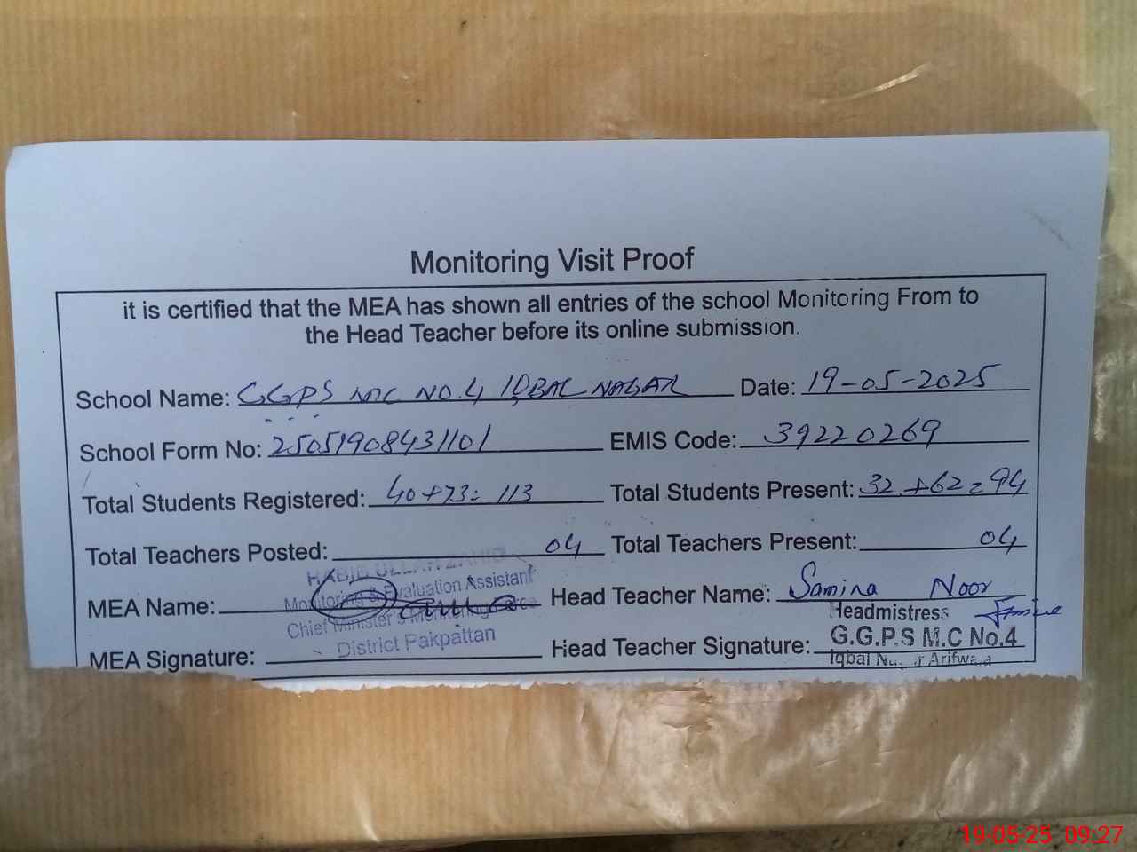 | EMIS Code: 39220269 | Name of School: GGPS MC NO. 4 IQBAL NAGAR ARIFWALA | |||