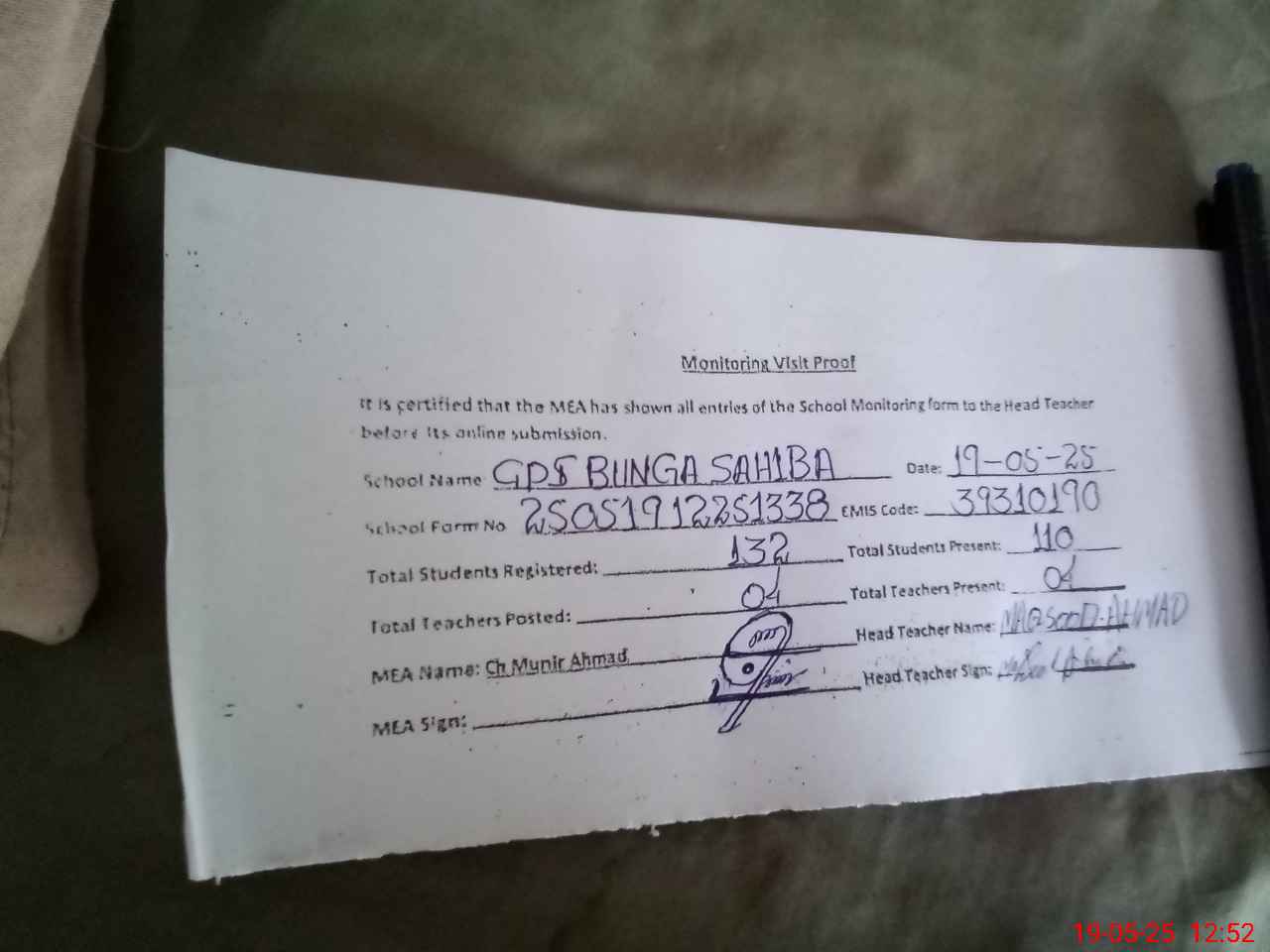 | Attendance Register | Head Teacher | MEA with School | Visit Proof |