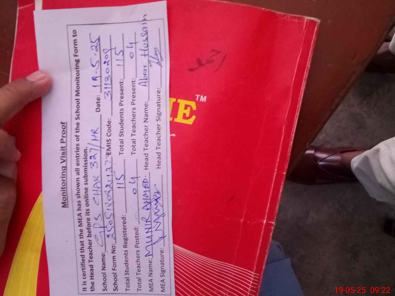 | Attendance Register | Head Teacher | MEA with School | Visit Proof |