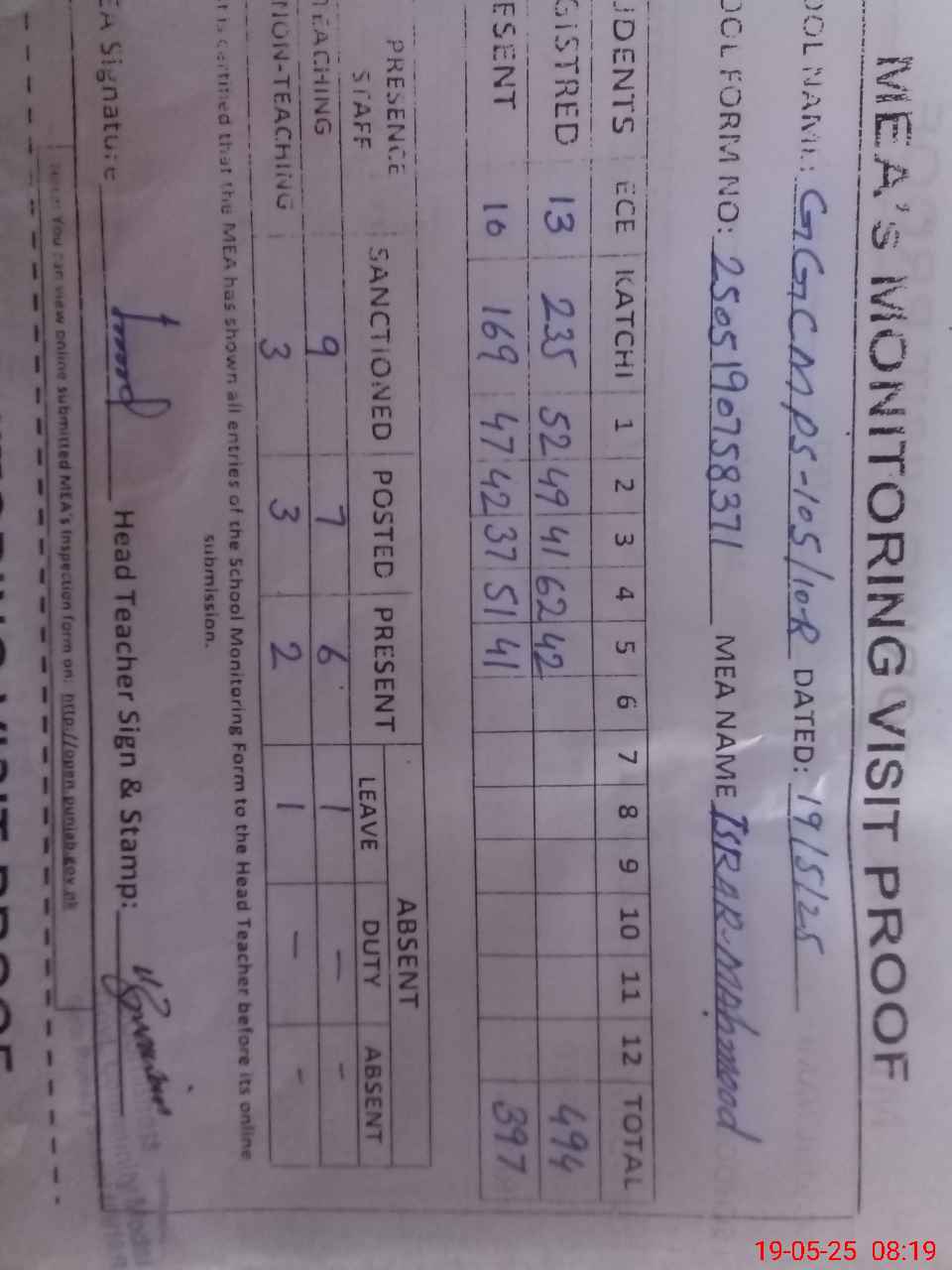 | Attendance Register | Head Teacher | MEA with School | Visit Proof |
