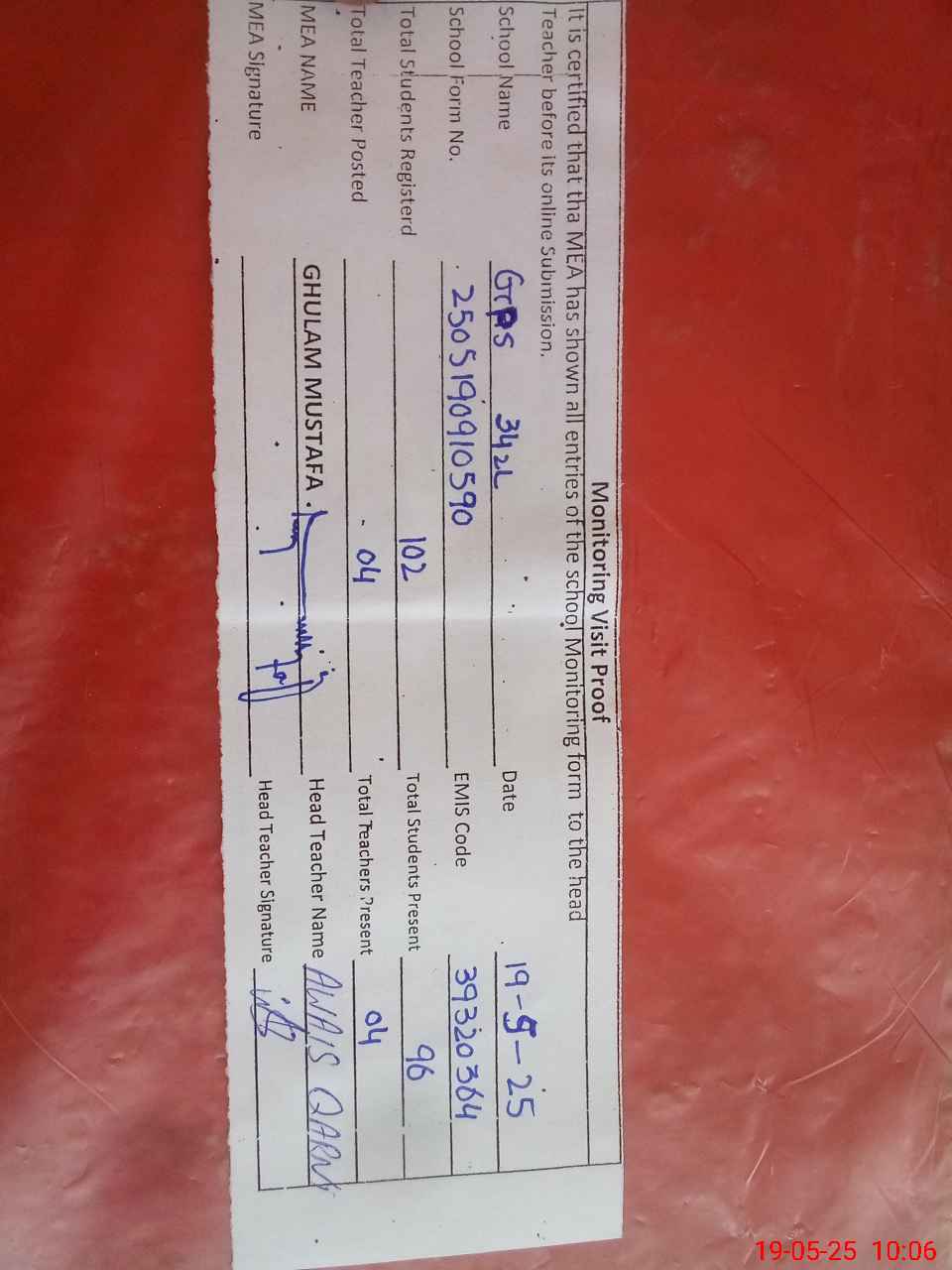 | Attendance Register | Head Teacher | MEA with School | Visit Proof |