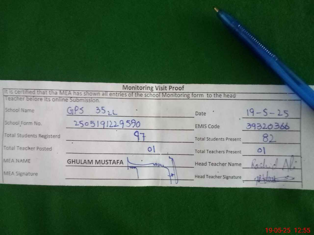 | Attendance Register | Head Teacher | MEA with School | Visit Proof |