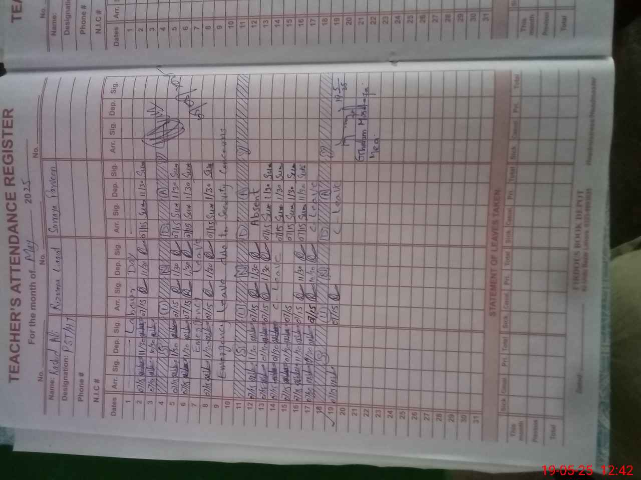 | CNIC | Full Name | Designation | R/C | Absence During Last Calender Month |
