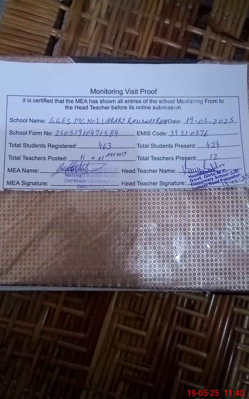 | EMIS Code: 39210376 | Name of School: GGES MC NO. 1 LIBRARY RAILWAY ROAD | |||