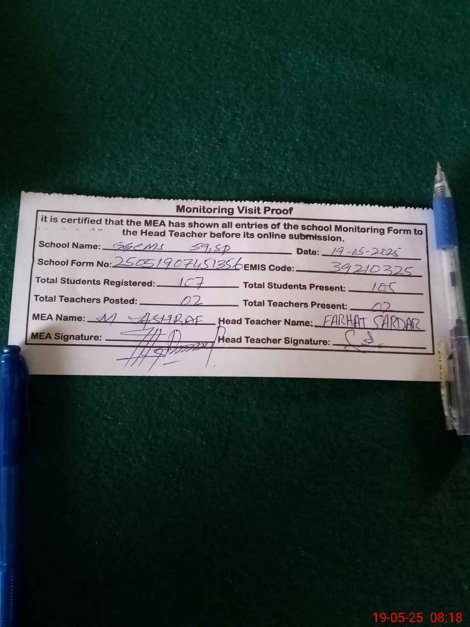 | Attendance Register | Head Teacher | MEA with School | Visit Proof |