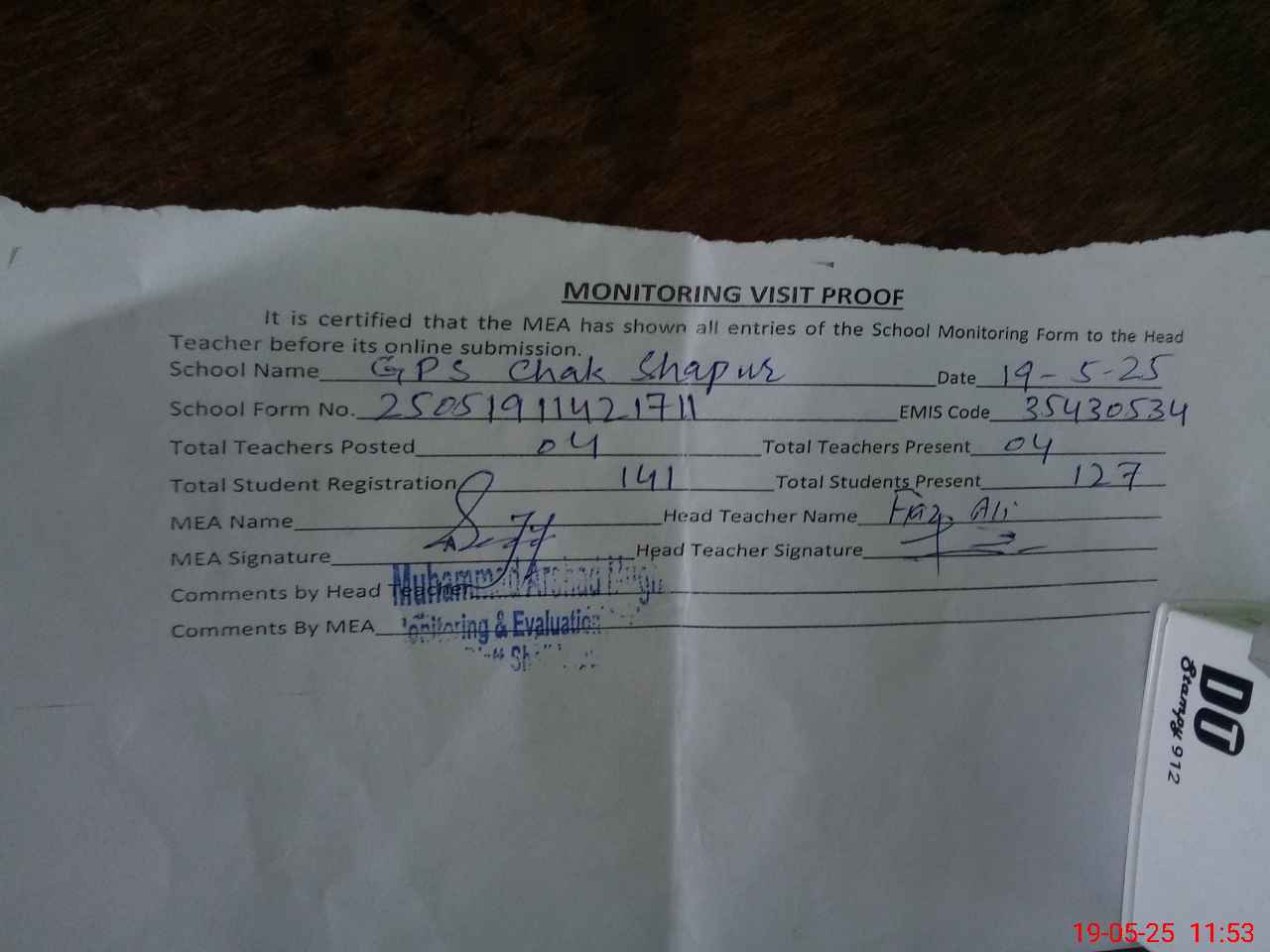 | EMIS Code: 35430534 | Name of School: GPS CHAK SHAH PUR | |||
