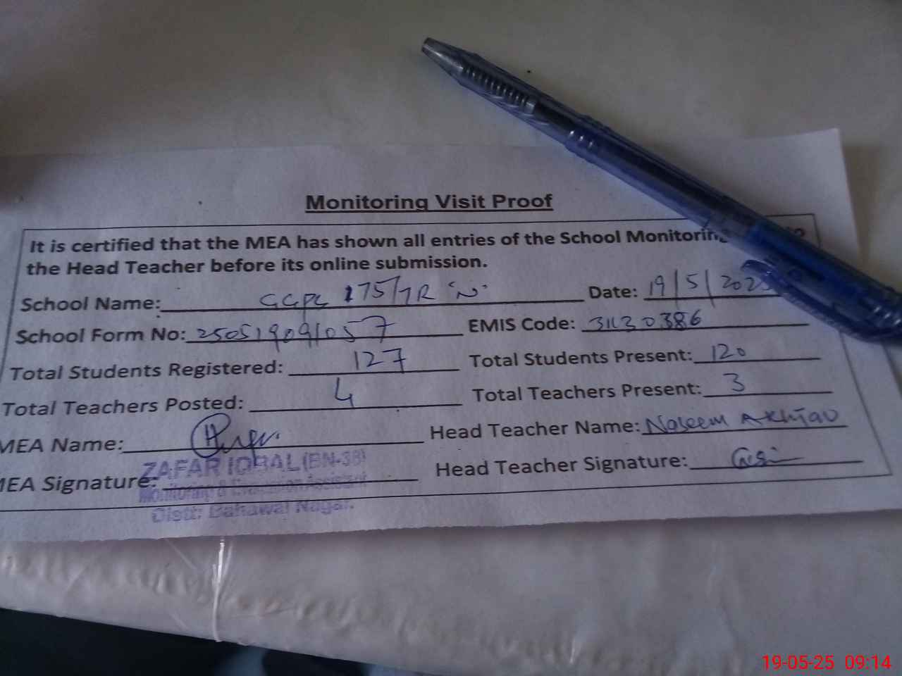 | Attendance Register | Head Teacher | MEA with School | Visit Proof |