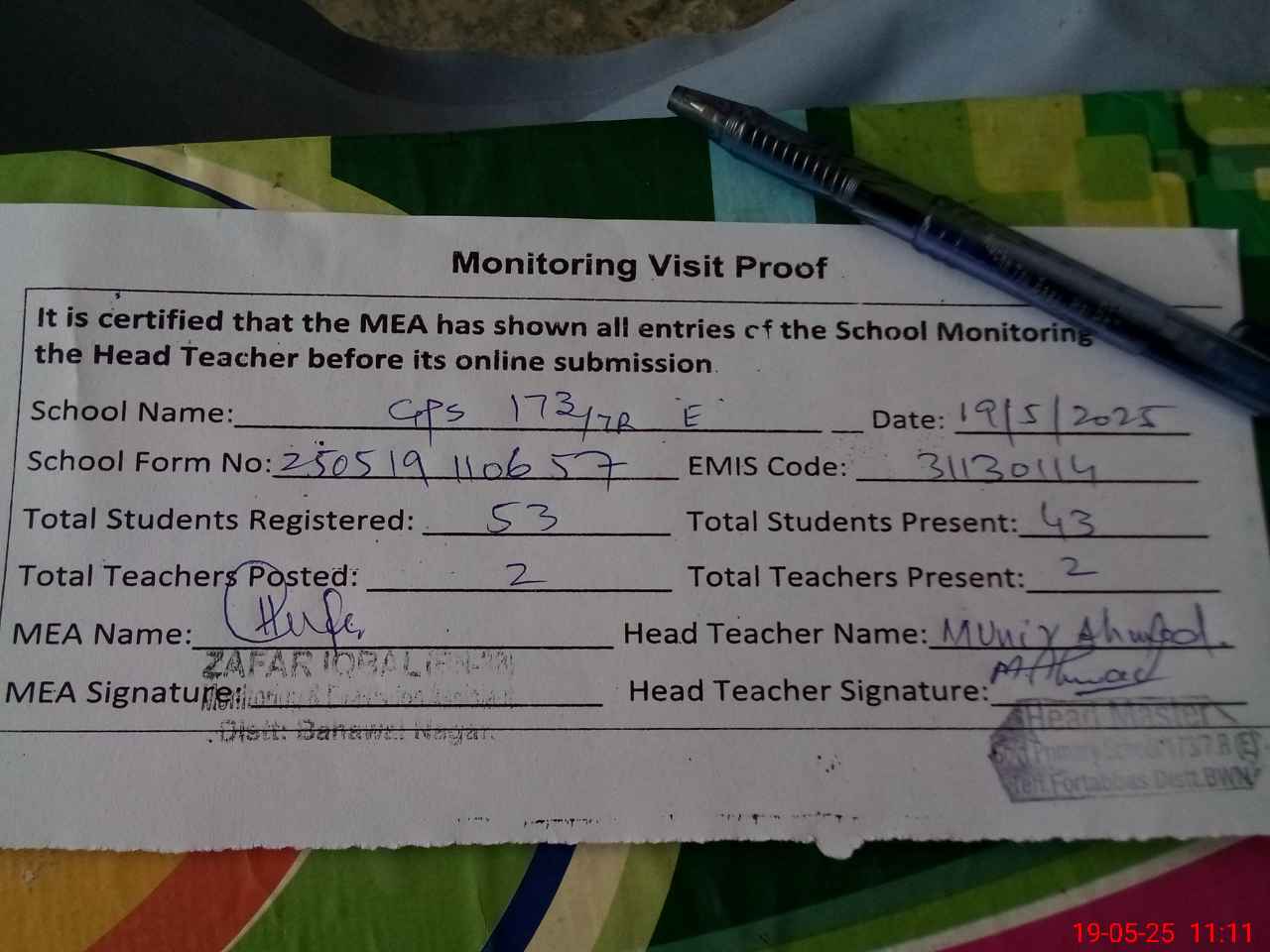 | Certified that this School was Inspected by the Undersigned MEA/DMO Today and the Information Stated Above is as Per Record. | |||||