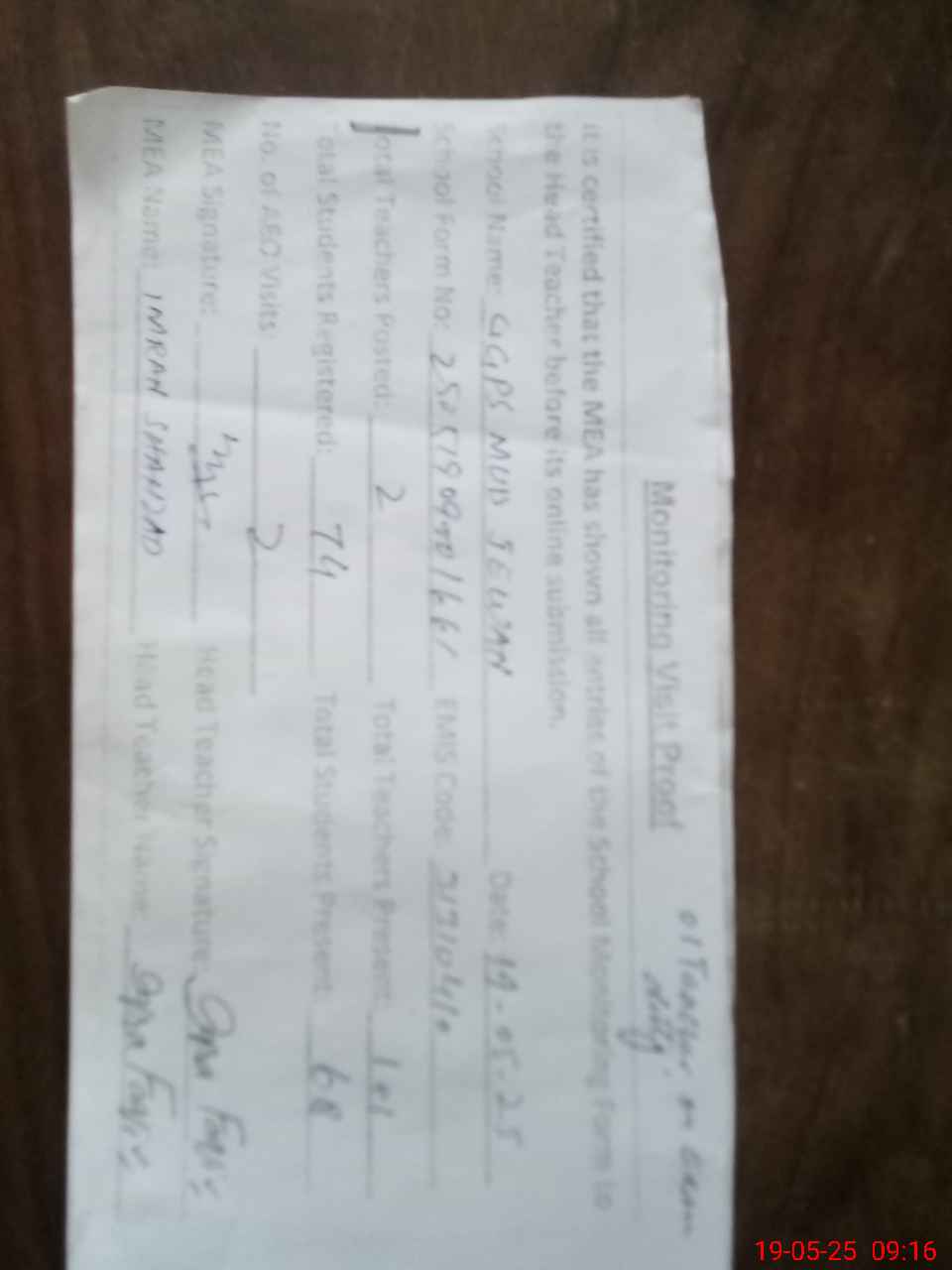 | Attendance Register | Head Teacher | MEA with School | Visit Proof |