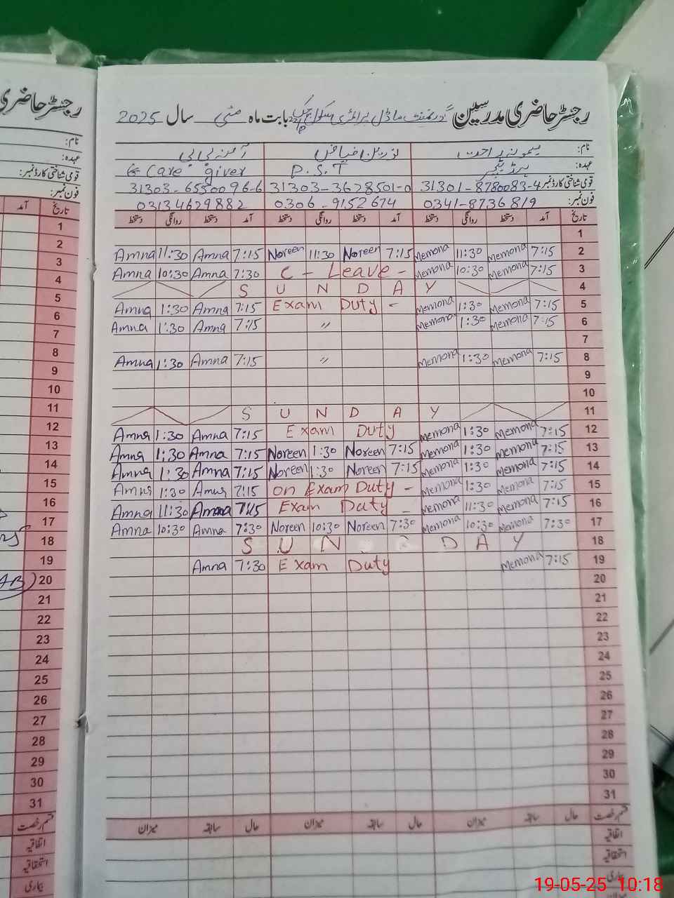 | 31**** | No**** Fi**** | PST | Regular | 1 | 1 | 0 | 0 | 0 | 0 | 0 | 0 | 1 | Exam Duty |