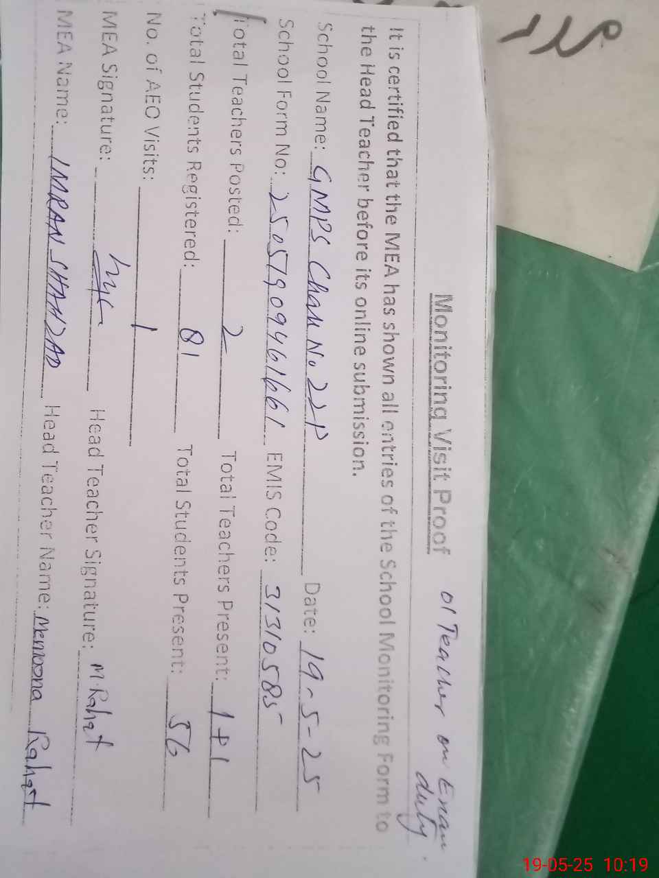 | Attendance Register | Head Teacher | MEA with School | Visit Proof |