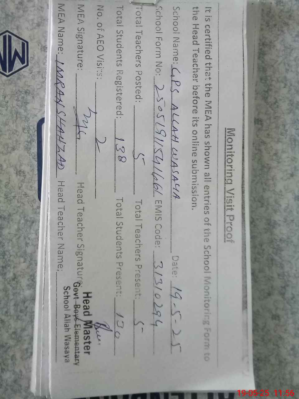 | Attendance Register | Head Teacher | MEA with School | Visit Proof |