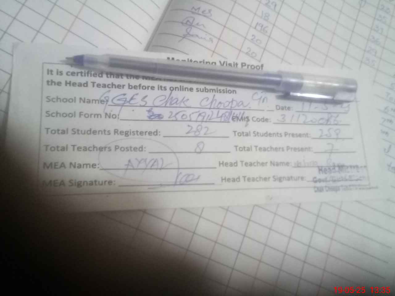 | Attendance Register | Head Teacher | MEA with School | Visit Proof |