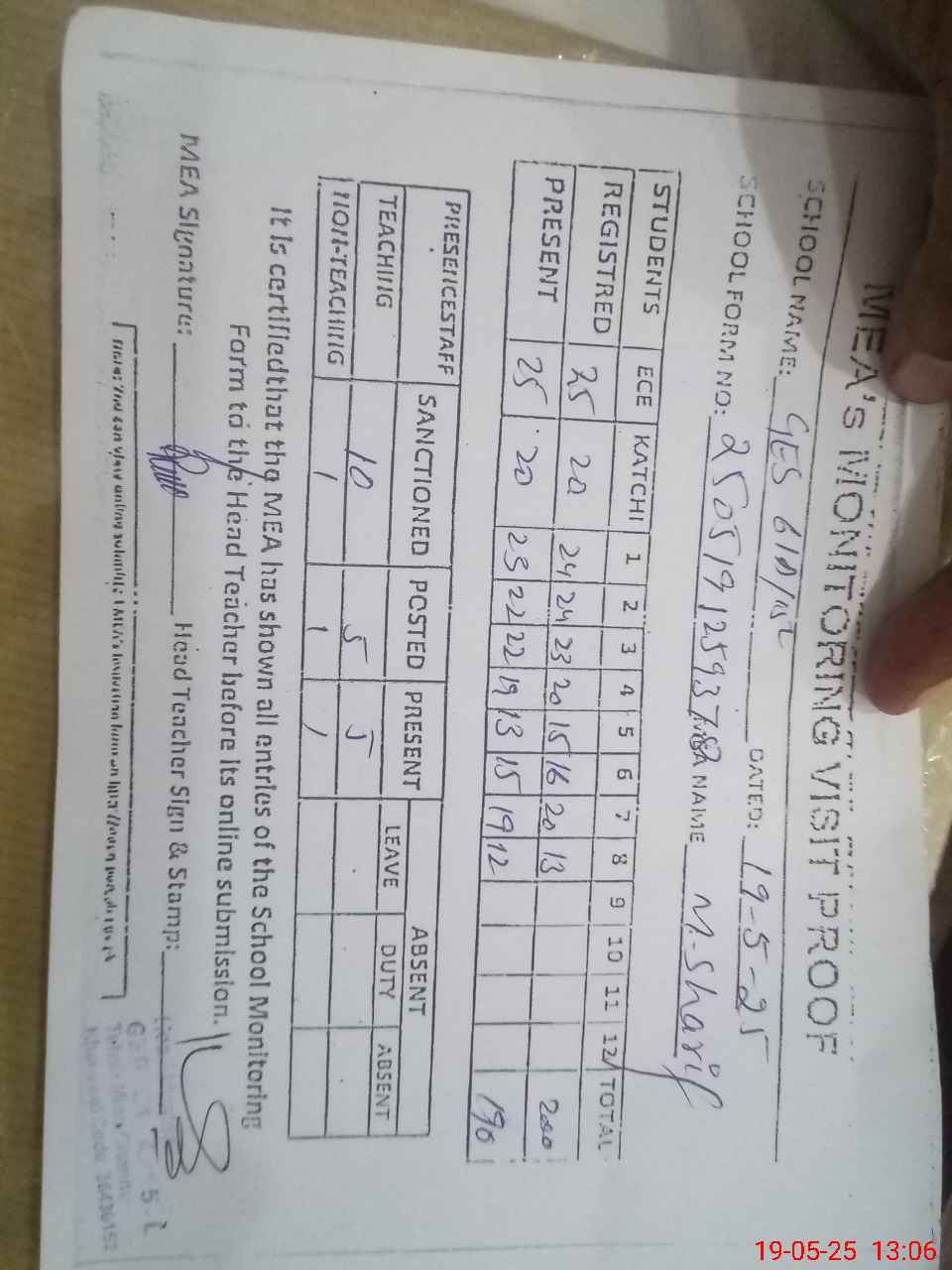 | Attendance Register | Head Teacher | MEA with School | Visit Proof |