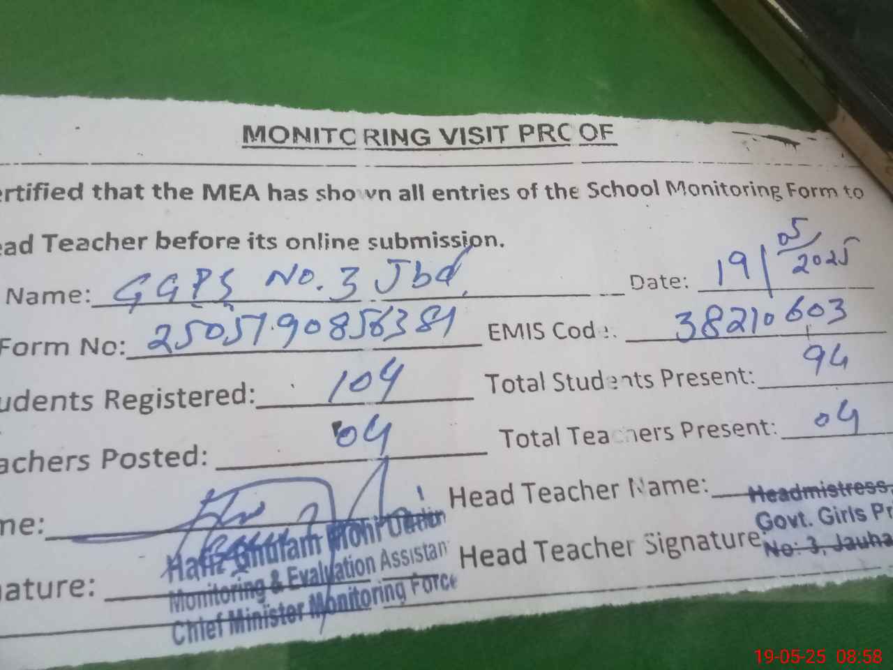 | EMIS Code: 38210603 | Name of School: GGPS NO. 3 JOUHAR ABAD | |||