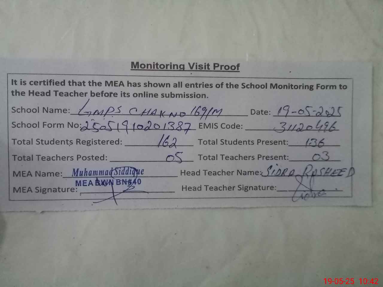 | Attendance Register | Head Teacher | MEA with School | Visit Proof |