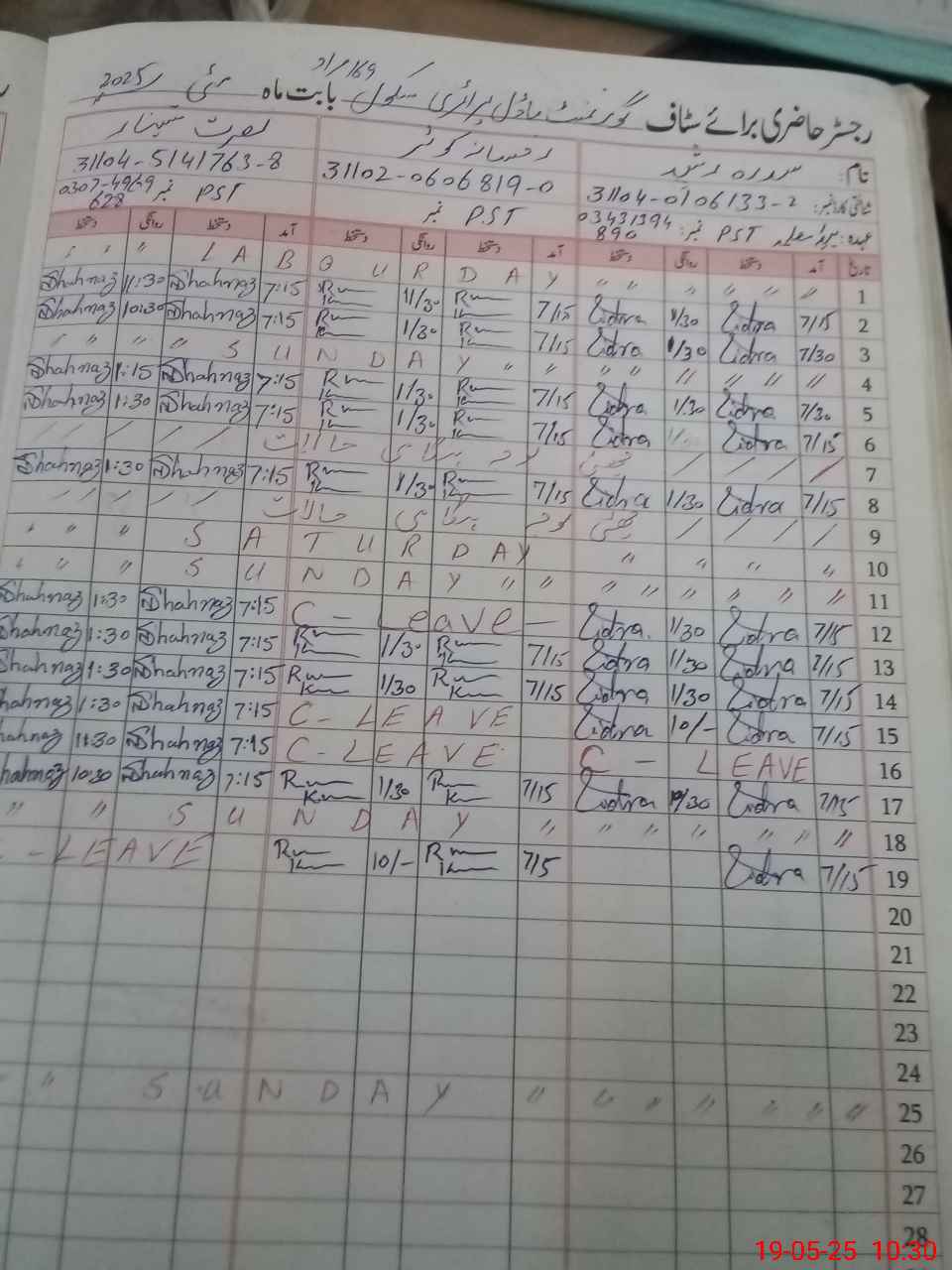 | CNIC | Full Name | Designation | R/C | Absence During Last Calender Month |
