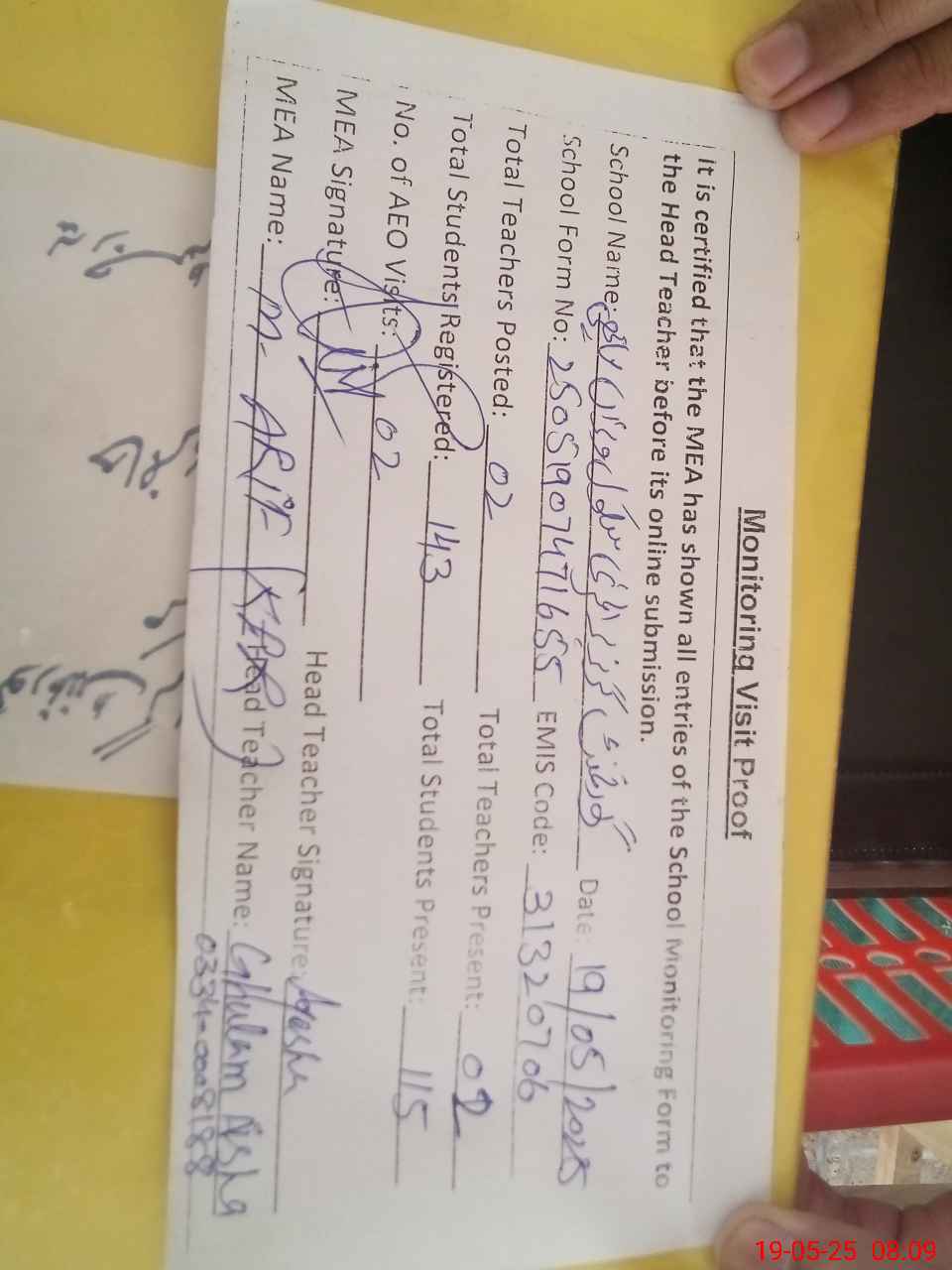 | Attendance Register | Head Teacher | MEA with School | Visit Proof |