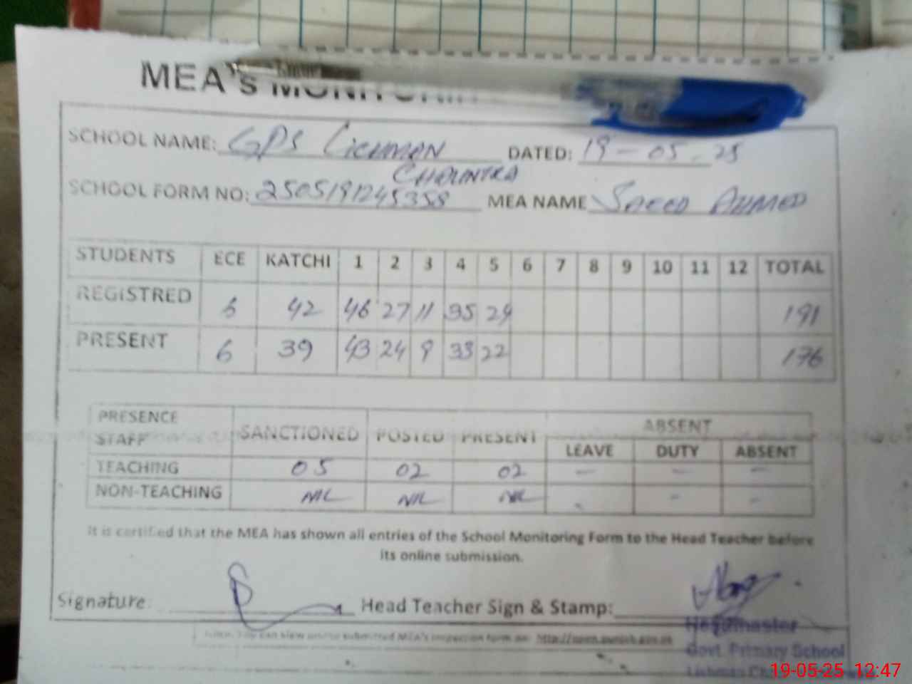 | Attendance Register | Head Teacher | MEA with School | Visit Proof |