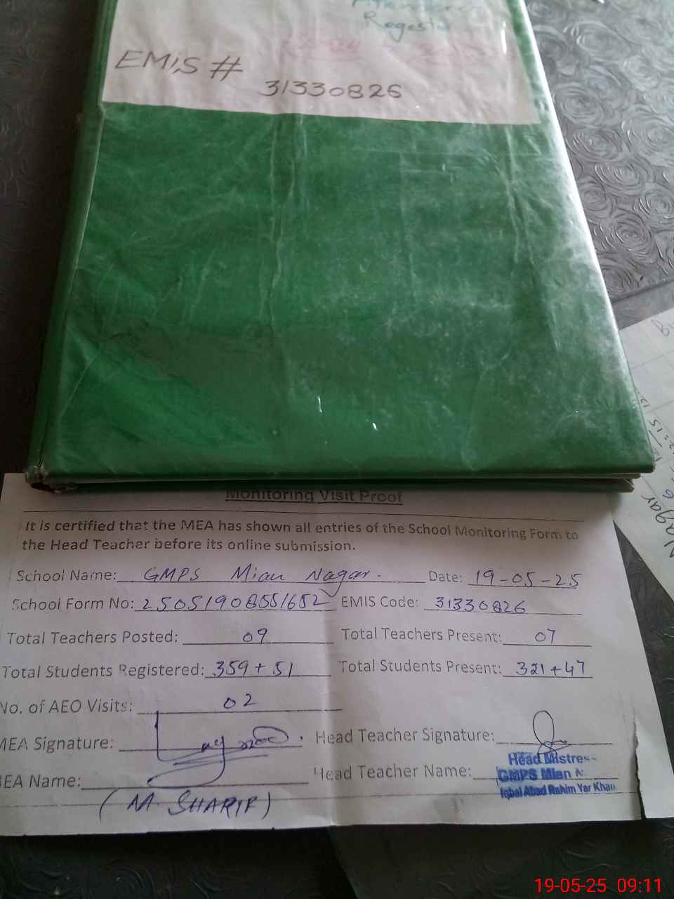| Attendance Register | Head Teacher | MEA with School | Visit Proof |