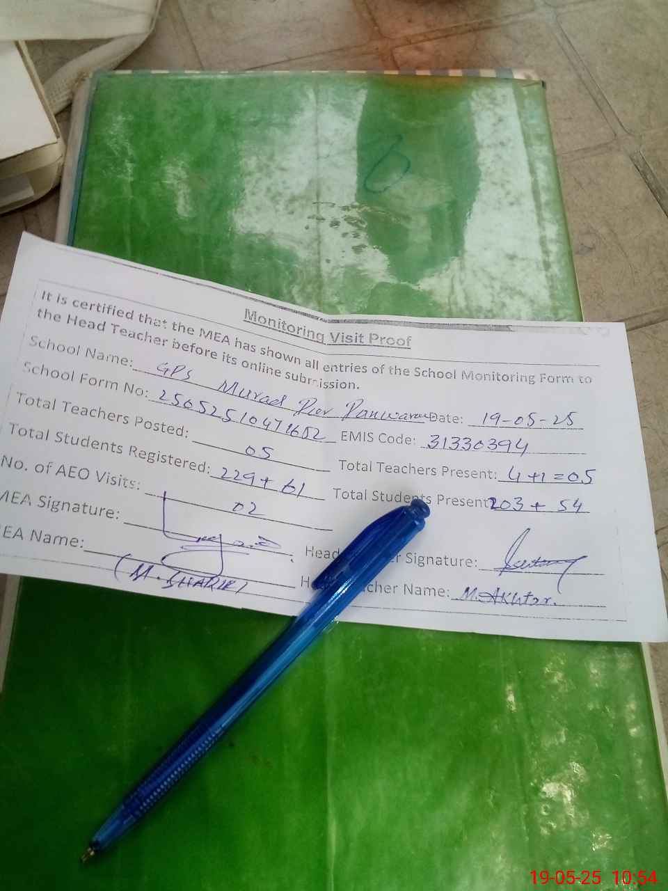 | Attendance Register | Head Teacher | MEA with School | Visit Proof |
