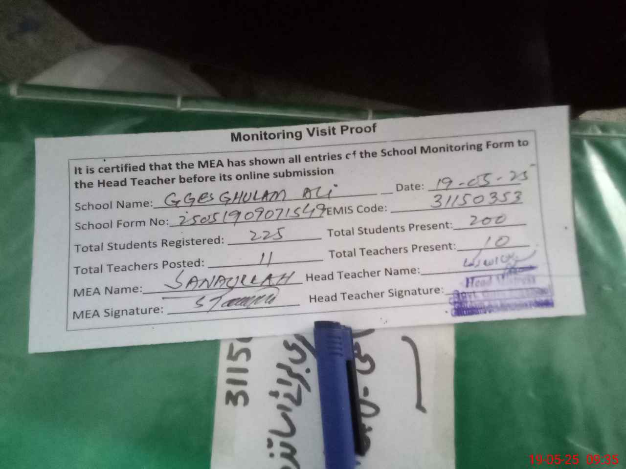 | Certified that this School was Inspected by the Undersigned MEA/DMO Today and the Information Stated Above is as Per Record. | |||||