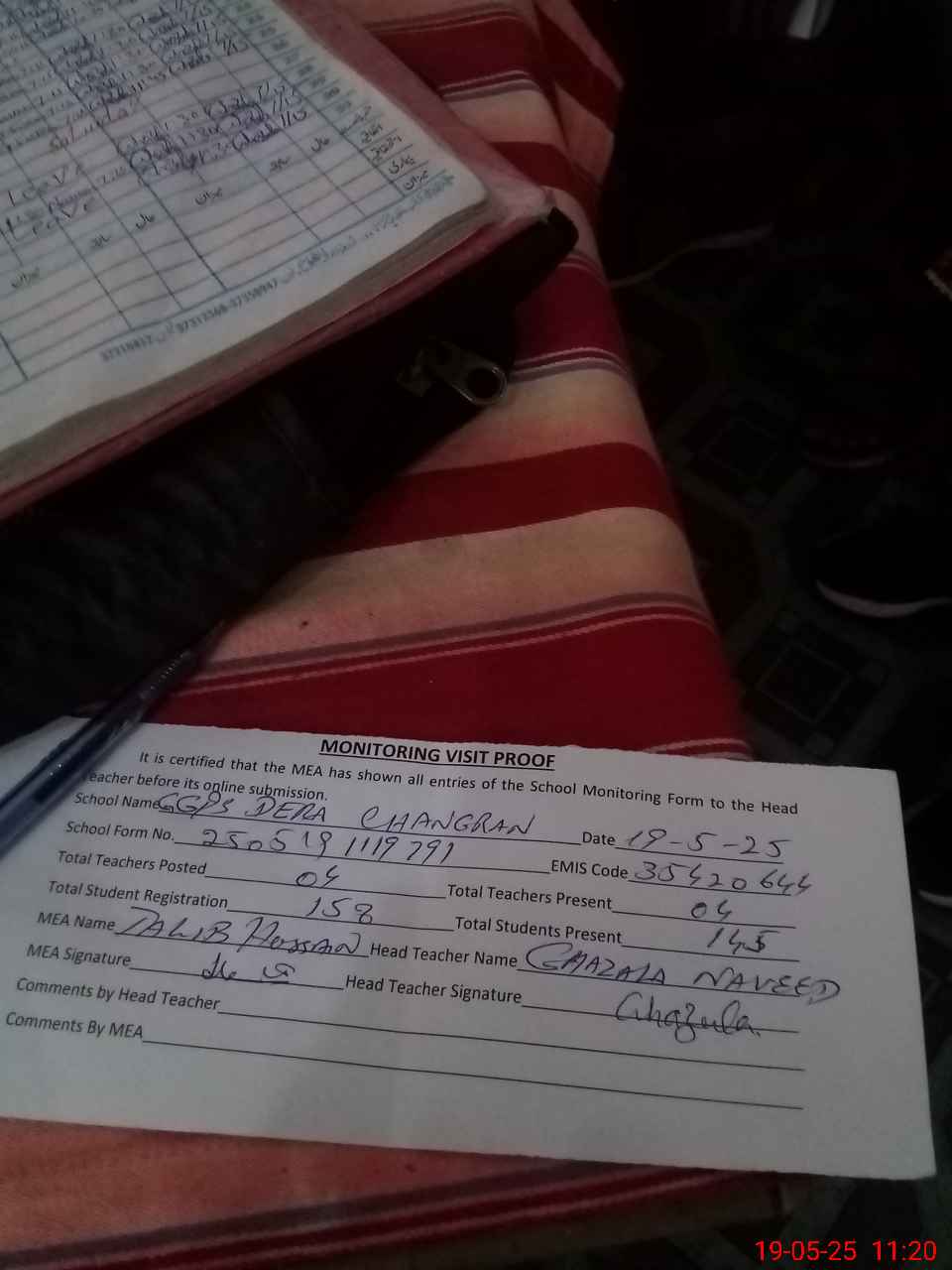 | Attendance Register | Head Teacher | MEA with School | Visit Proof |