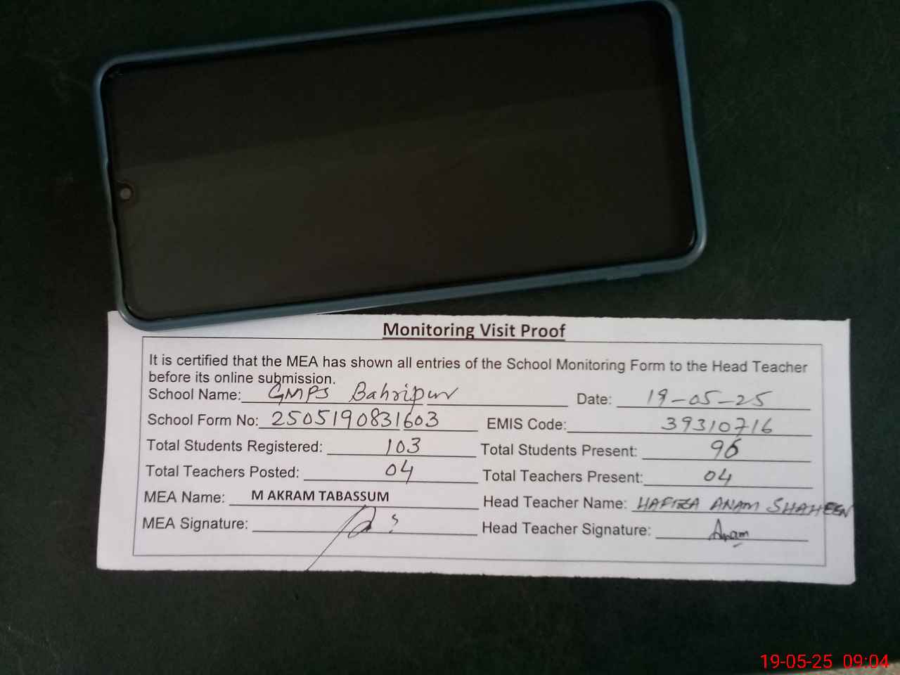 | Attendance Register | Head Teacher | MEA with School | Visit Proof |