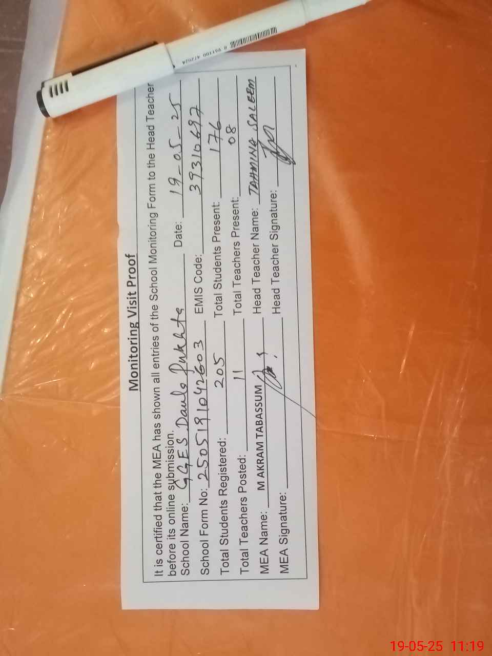 | Attendance Register | Head Teacher | MEA with School | Visit Proof |