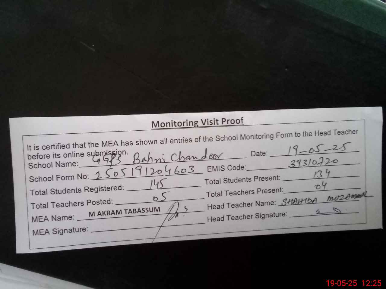 | Attendance Register | Head Teacher | MEA with School | Visit Proof |