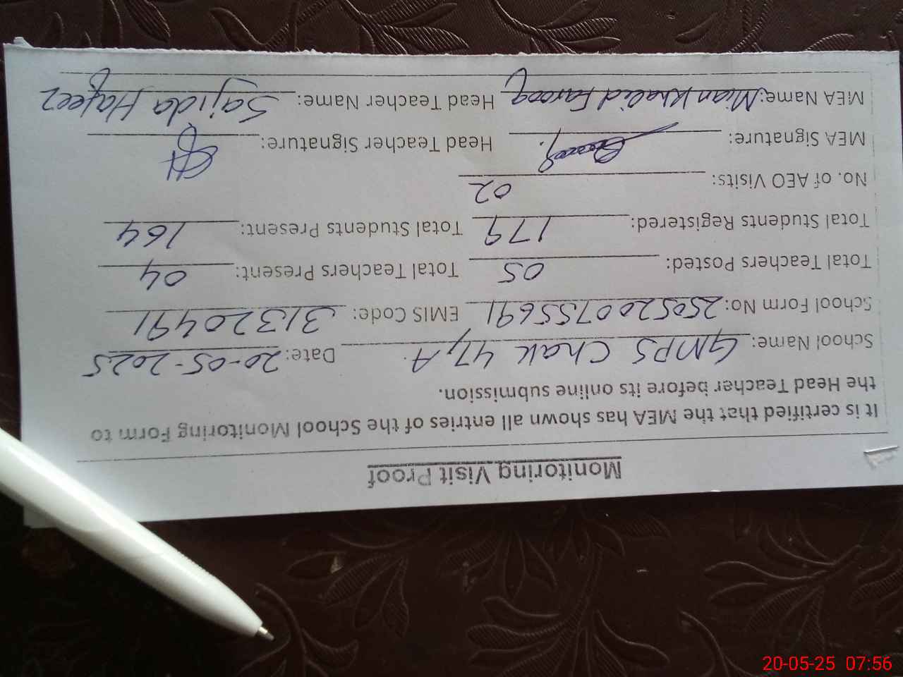 | Attendance Register | Head Teacher | MEA with School | Visit Proof |