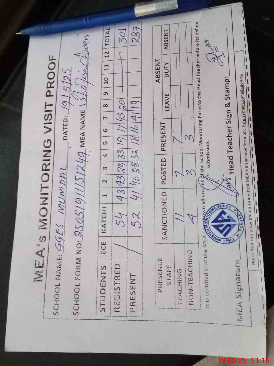 | Attendance Register | Head Teacher | MEA with School | Visit Proof |
