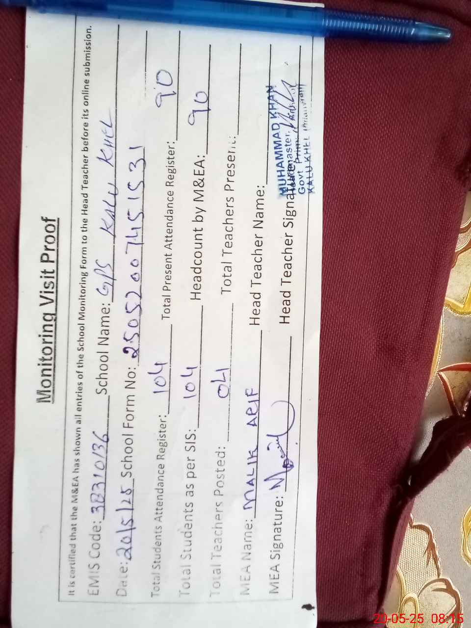 | Attendance Register | Head Teacher | MEA with School | Visit Proof |