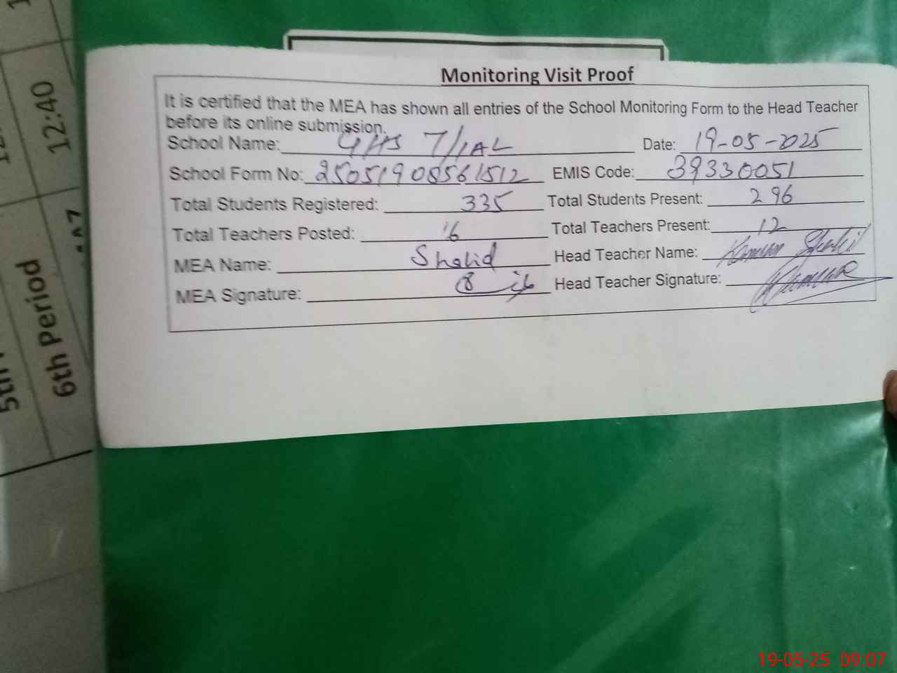 | Certified that this School was Inspected by the Undersigned MEA/DMO Today and the Information Stated Above is as Per Record. | |||||