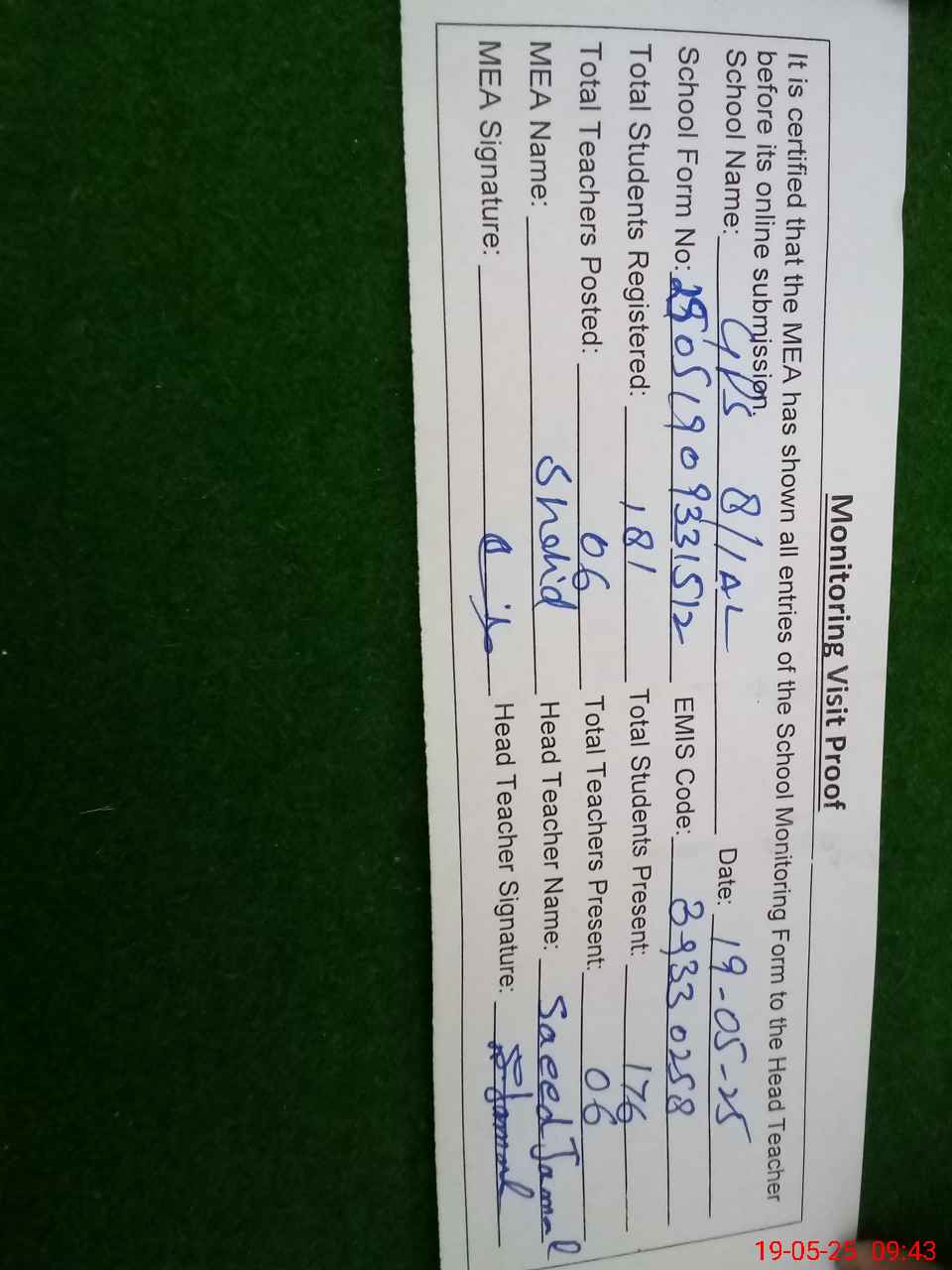 | Certified that this School was Inspected by the Undersigned MEA/DMO Today and the Information Stated Above is as Per Record. | |||||