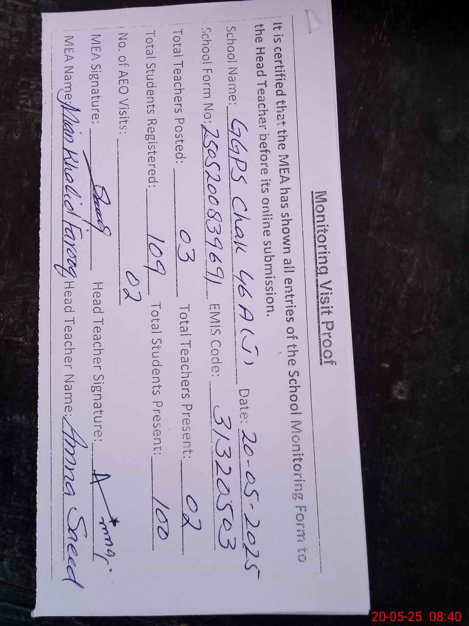 | EMIS Code: 31320503 | Name of School: GGPS CHAK NO.46/JADEED | |||