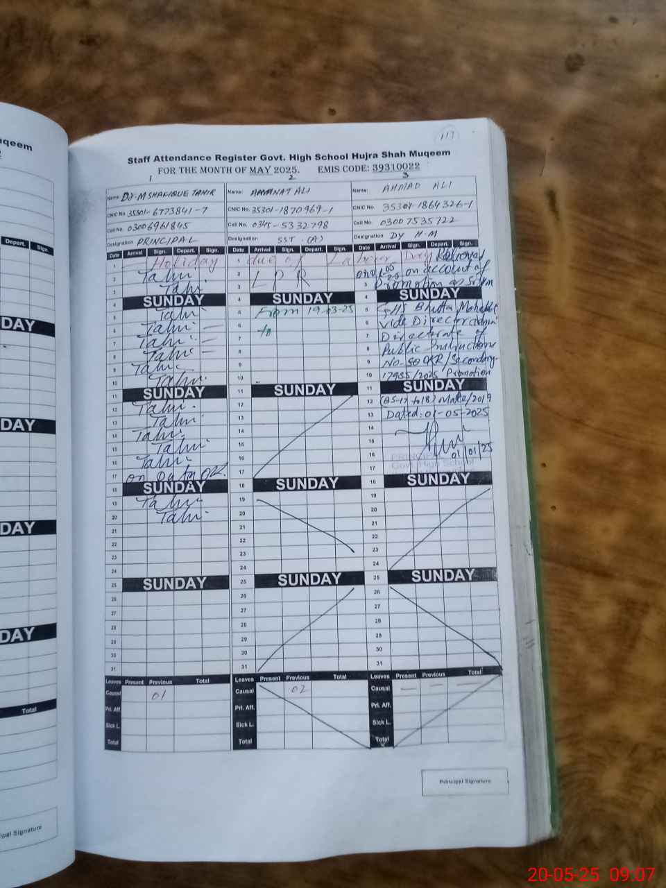 | CNIC | Full Name | Designation | R/C | Absence during last cal. month |