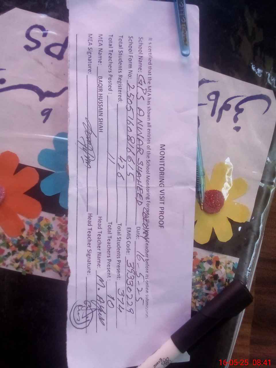 | Attendance Register | Head Teacher | MEA with School | Visit Proof |