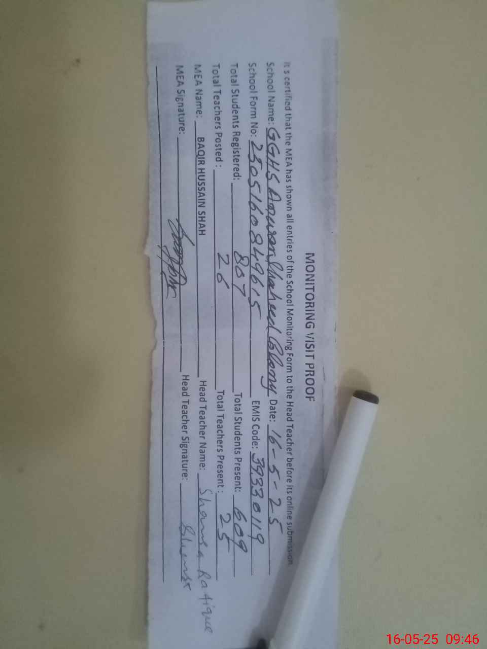 | Attendance Register | Head Teacher | MEA with School | Visit Proof |