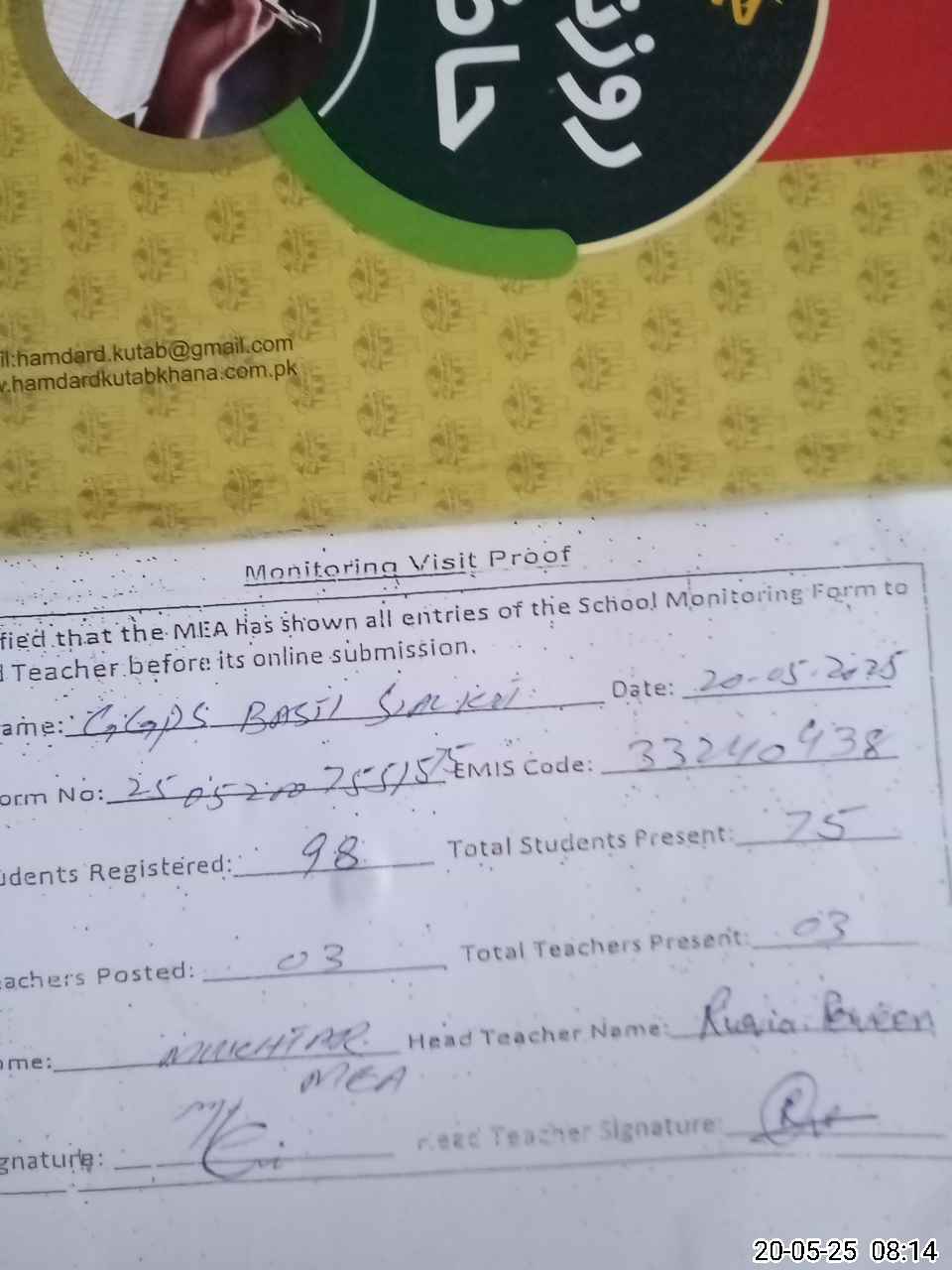 | Attendance Register | Head Teacher | MEA with School | Visit Proof |