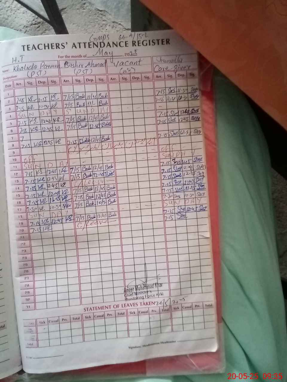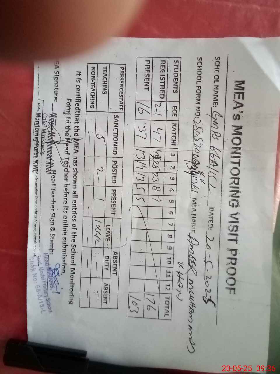 | Attendance Register | Head Teacher | MEA with School | Visit Proof |