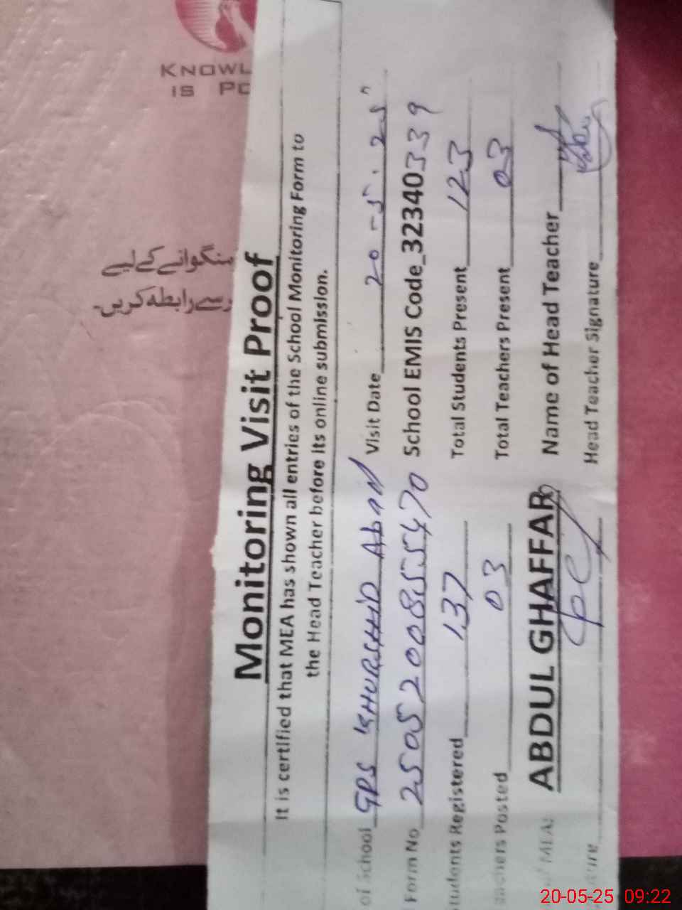 | Attendance Register | Head Teacher | MEA with School | Visit Proof |